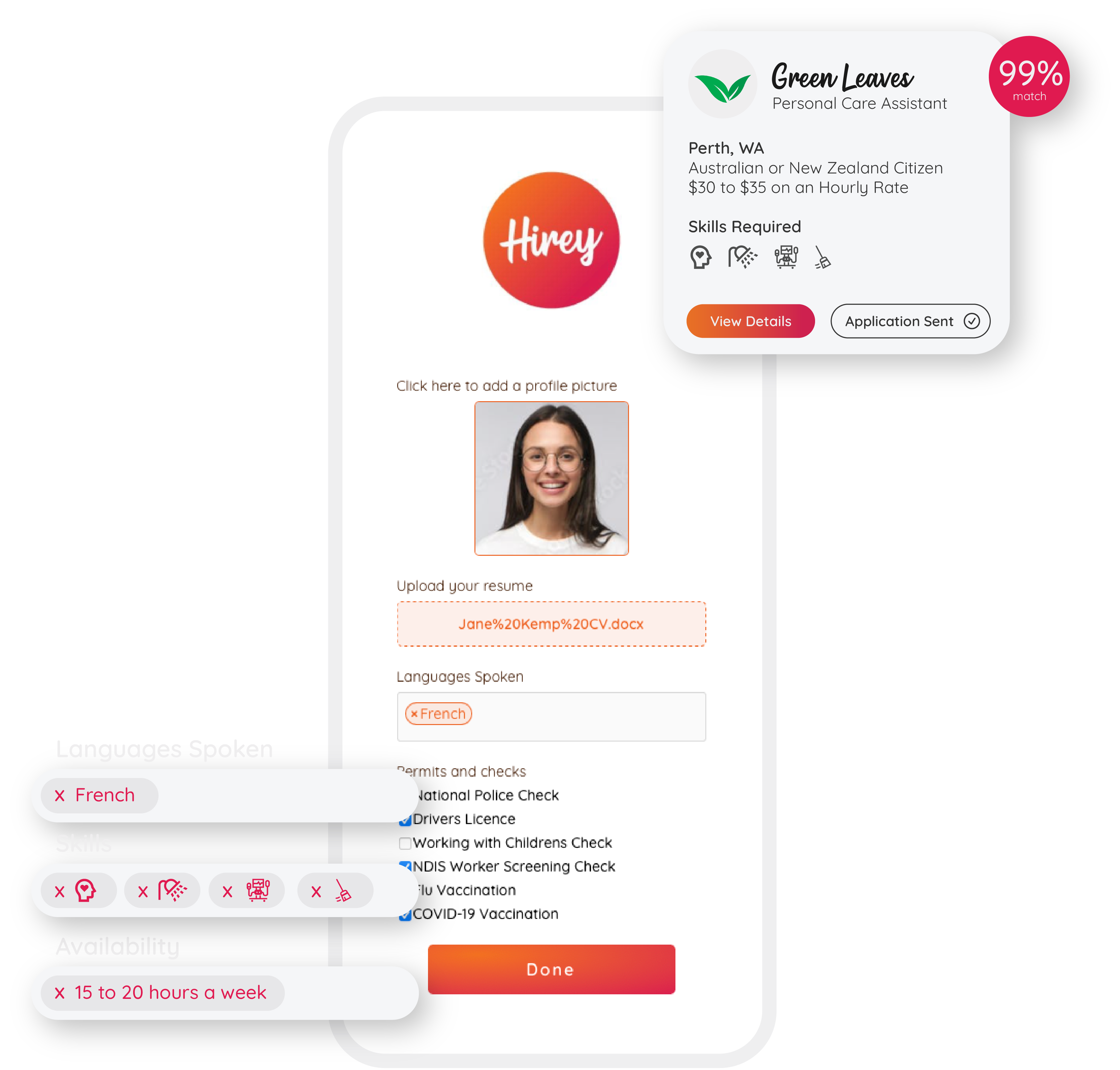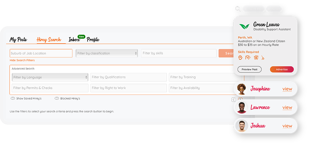 Individuals looking for support worker jobs or aged care jobs can use Hirey to connect with Aged Care Providers and NDIS Providers keen to hire new staff. They can view and apply for job vacancies being advertised directly on the Hirey platform, or can be found by employers browsing worker profiles and be contacted directly.